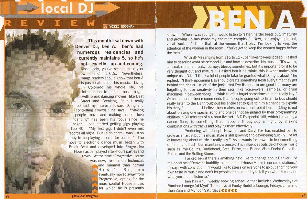 ben A has also been a staple in the Denver music scene for well over a decade, and has made lasting impressions for his opening sets for A-List DJs across the globe. Recent opening sets for include: Pete Tong, Bad Boy Bill, Armin Van Buuren, Thugfucker, Doc Martin, Lisa Shaw, H-Foundation, Miguel Miggs, D-Julez, Josh Wink, Louie Vega, Eric Morrilo, Terry Francis, Marques Wyatt, Mark Farina, Derrick Carter, James Zabiela, Dj Three, and many more.